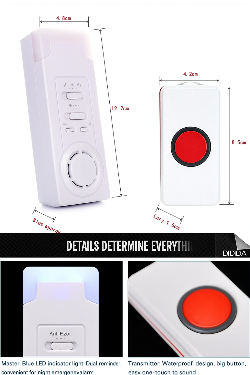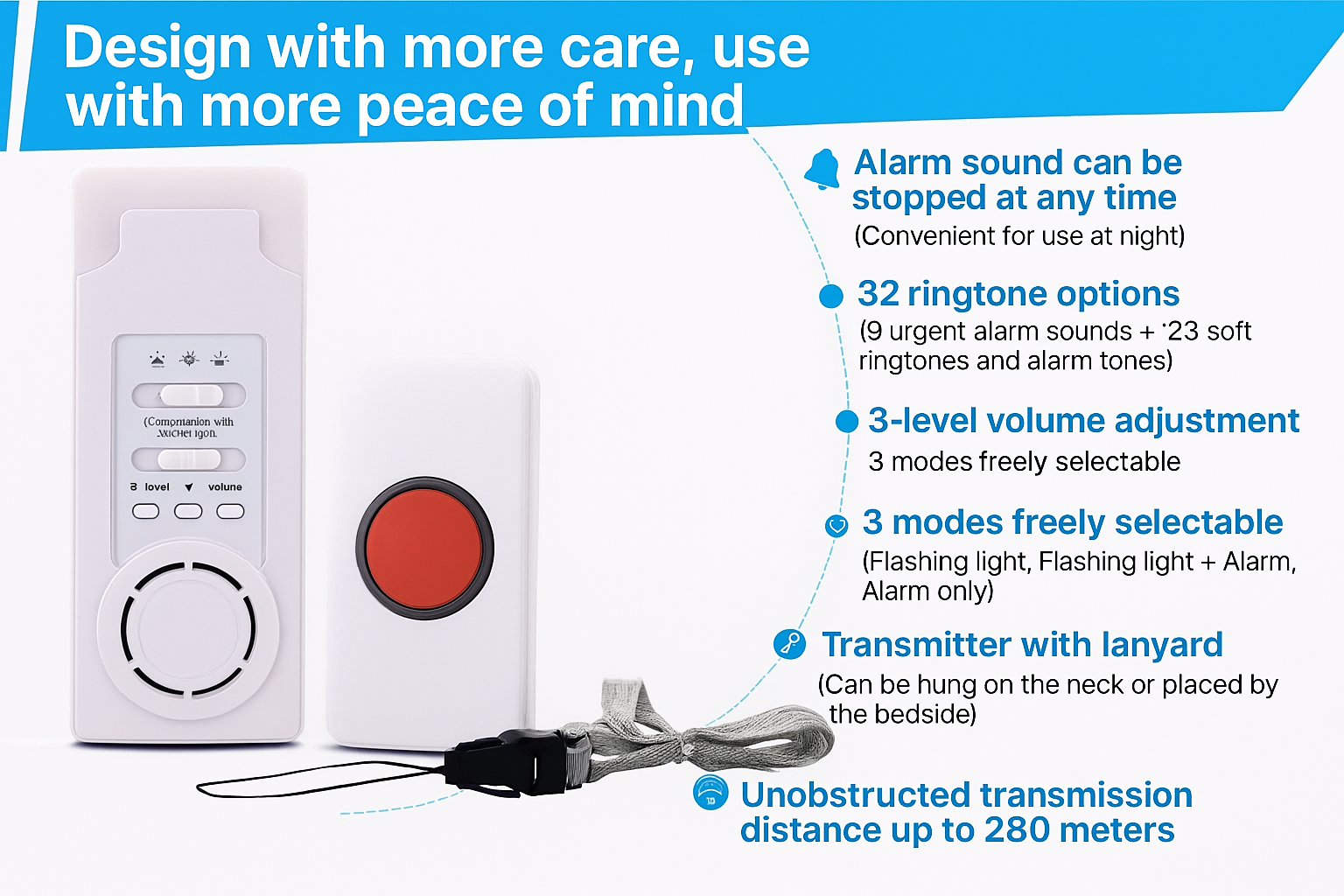 - ✔️ 簡單安裝與攜帶:接收器可壁掛、桌放或放床頭;發射器附掛繩可隨身攜帶或掛頸上。