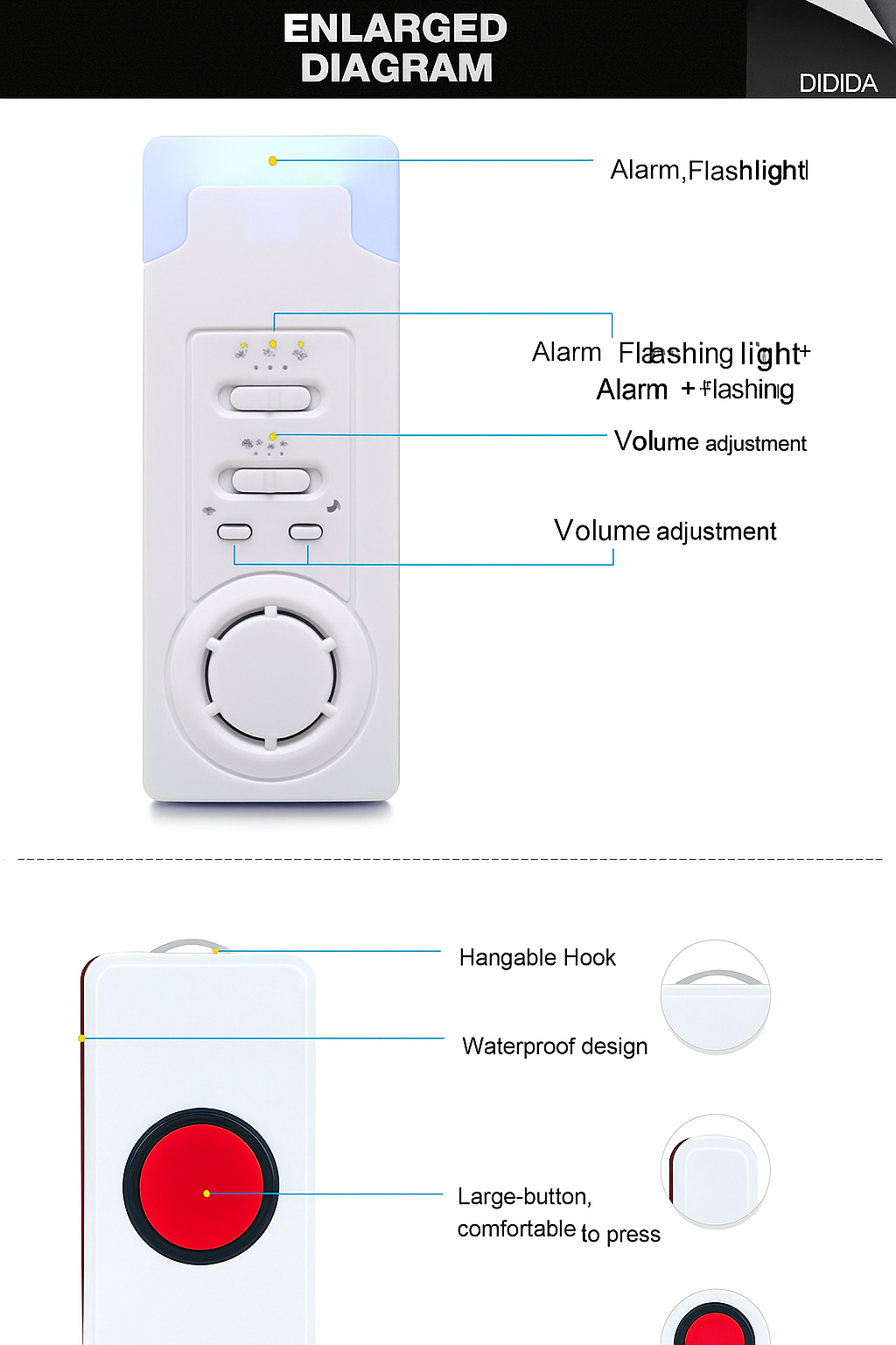 - ✔️ 聲光雙重提示:紅色閃燈搭配可調音量鈴聲,適合聽力或視力較弱的長者使用。